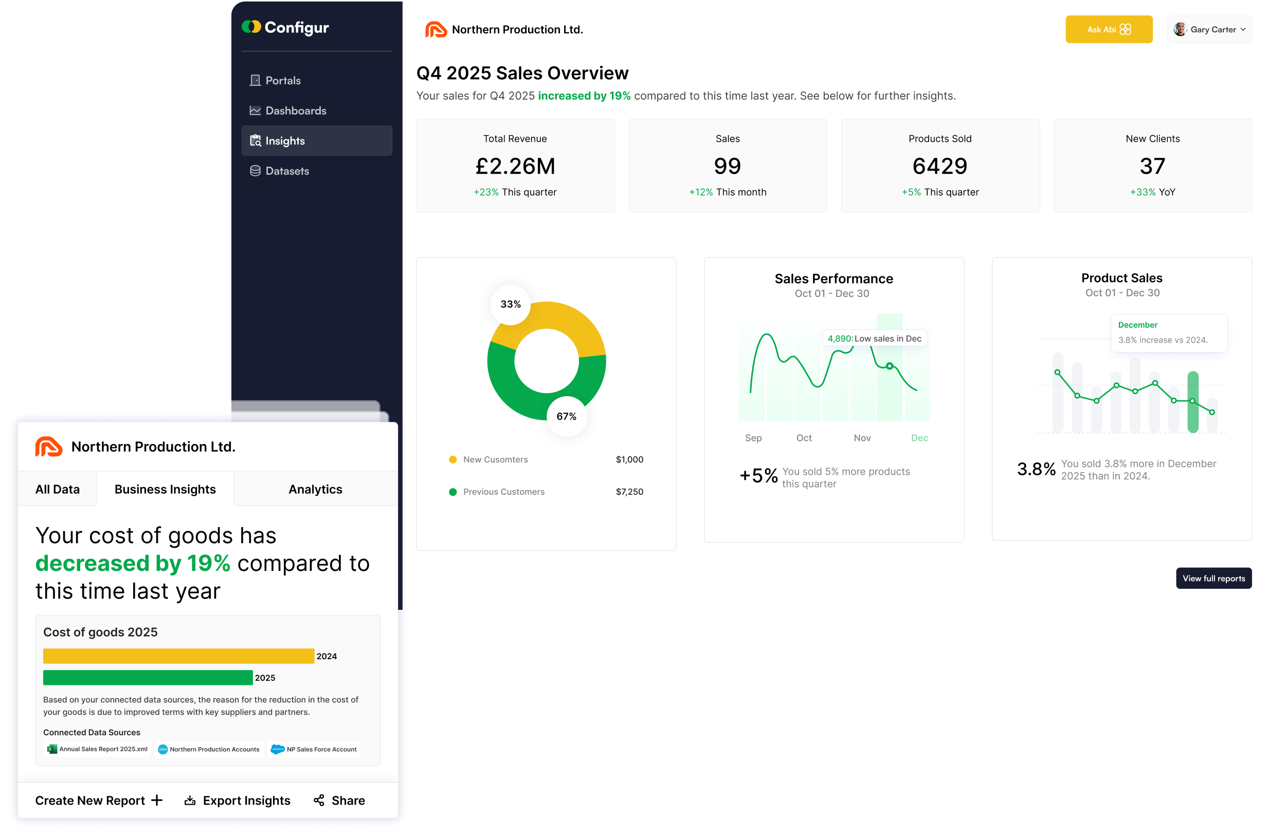 Our Configur platform connects, cleans and structures data from across your organisation, giving every team a consistent, trusted view of performance, risk and opportunity.